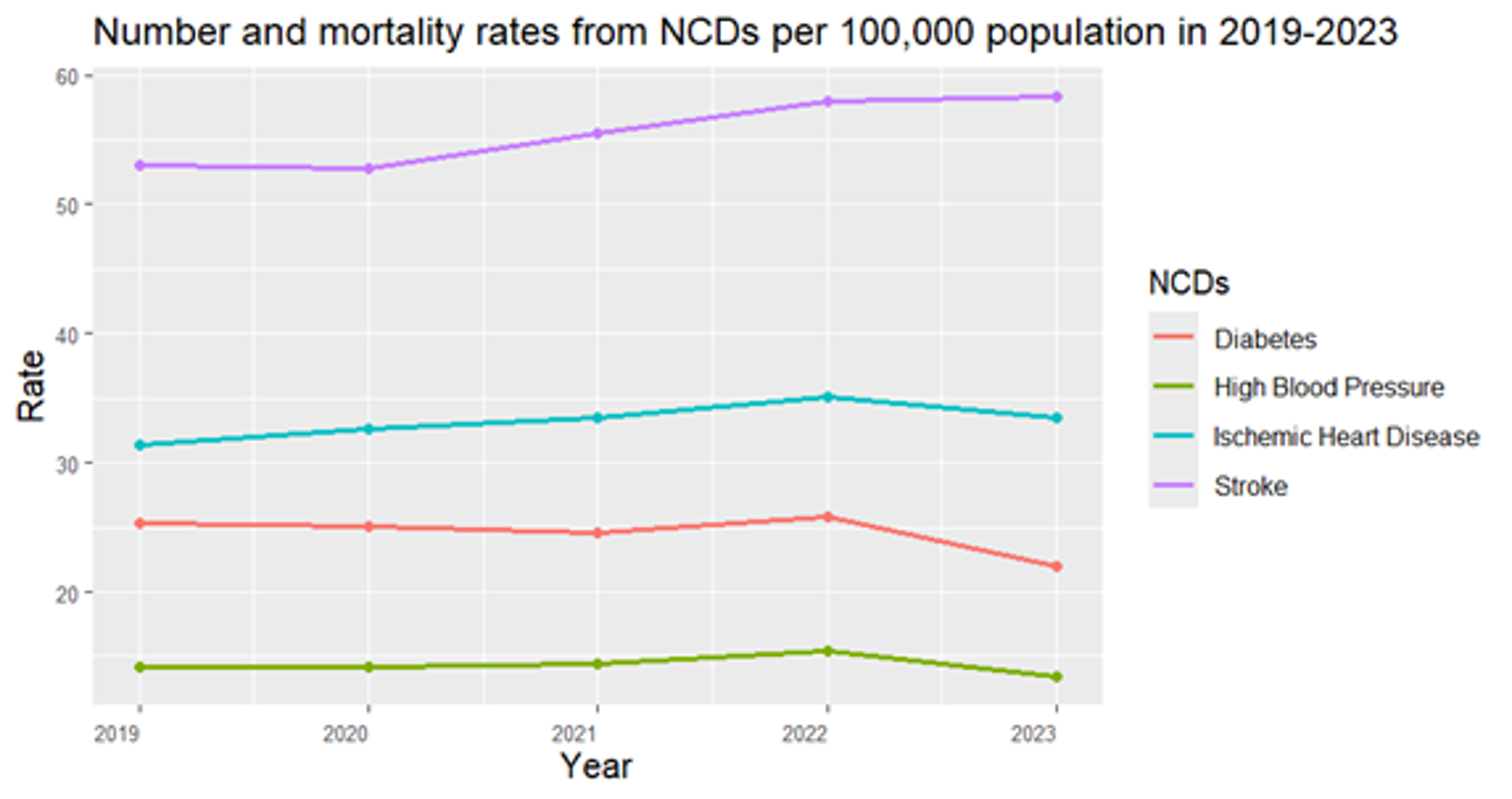 กลุ่มโรคที่ทำให้สูญเสียปีสุขภาวะ (DALYs) สูงสุด คือโรคในกลุ่ม หัวใจและหลอดเลือด เบาหวาน และไตเรื้อรัง รวมถึงมะเร็ง ซึ่งรวมกันคิดเป็นสัดส่วนถึง 44% ของภาระโรคทั้งหมด