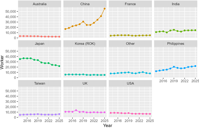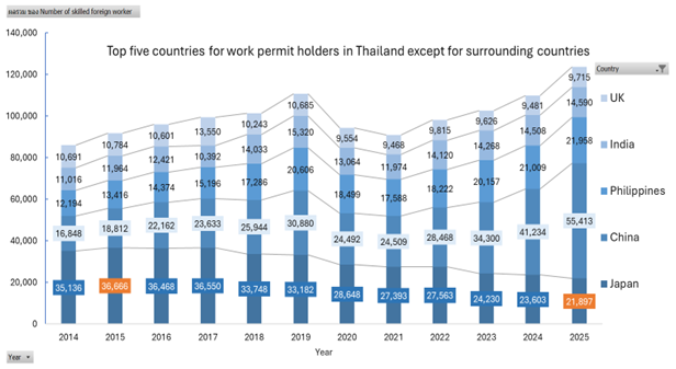 Japan, once a major source of foreign skilled workers, has shown a gradual decline—from 36,666 workers in 2015 to 21,897 in 2025—possibly due to changes in Japanese investment structures and production bases in Thailand.